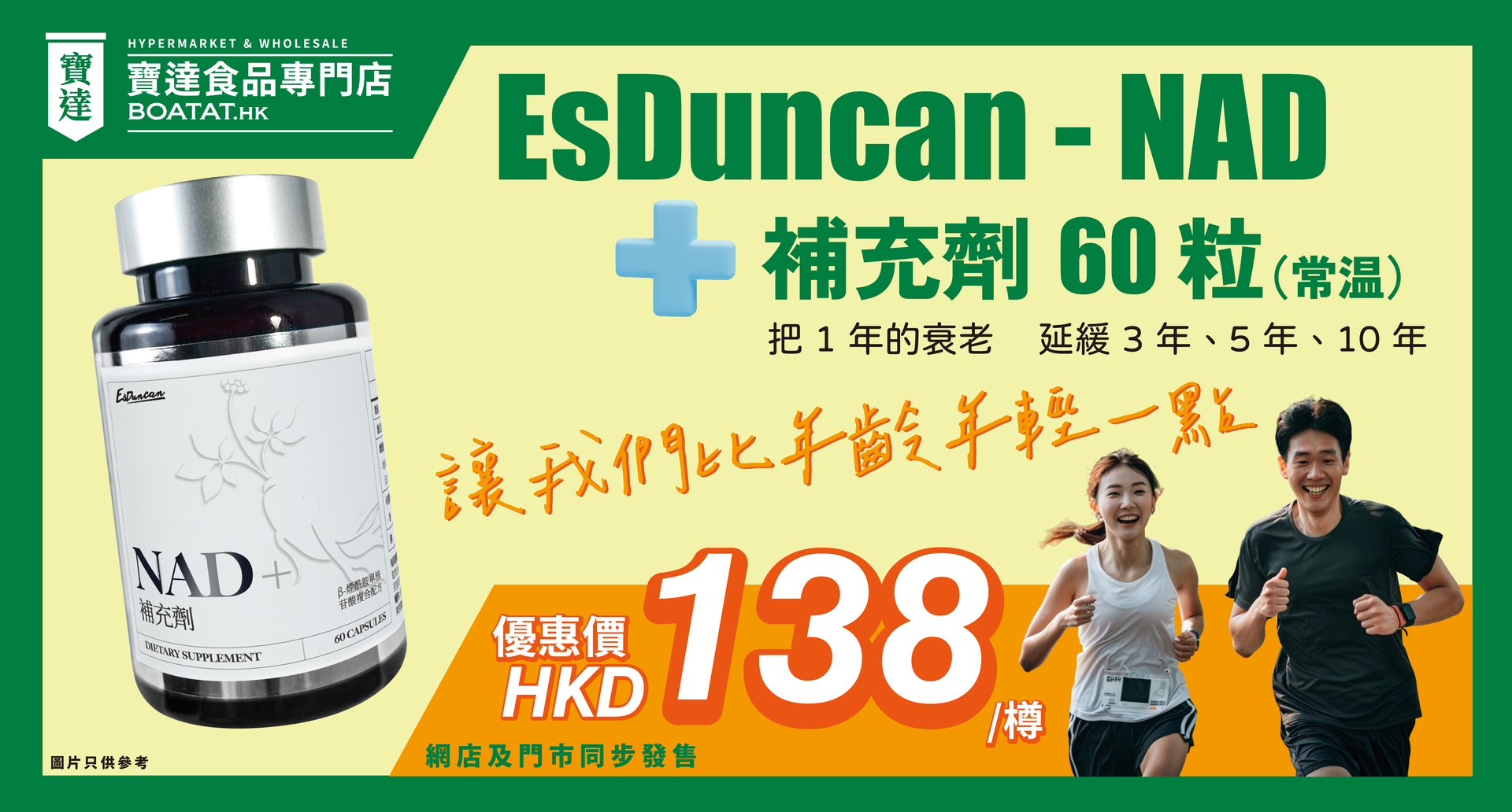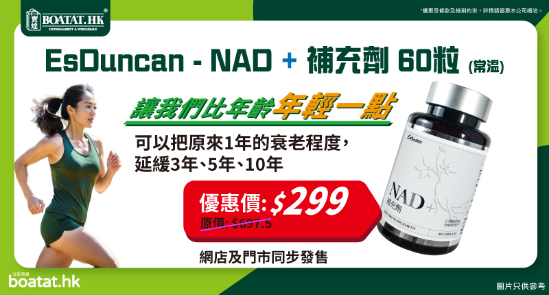 本週like and share優惠:【EsDuncan - NAD+補充劑 60粒】- 優惠價$299(原價$697.5)|本週每買滿$500 即可以$20換購【寶達牌】頂級罐裝即食鮑魚160G】(原價$35)