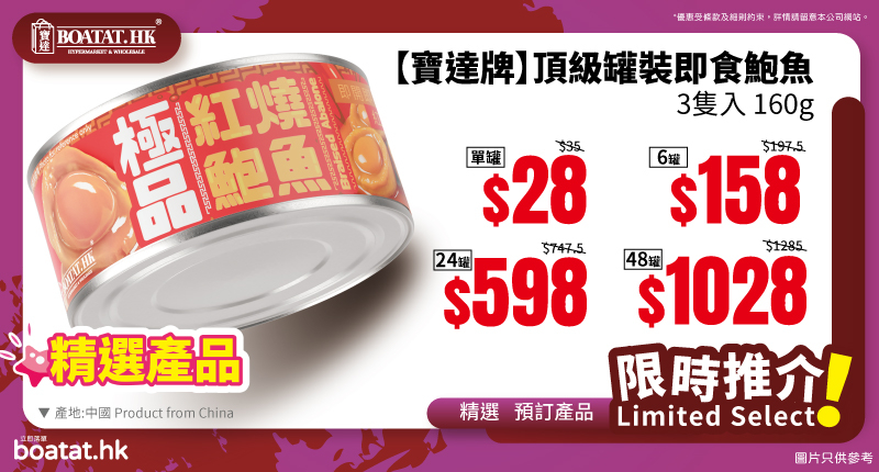 本週like and share優惠:【西班牙爆谷吞拿魚粒 200g】- 優惠價$20(原價$60)|本週每買滿$500 即可以$20換購【寶達牌】頂級罐裝即食鮑魚160G】(原價$35)