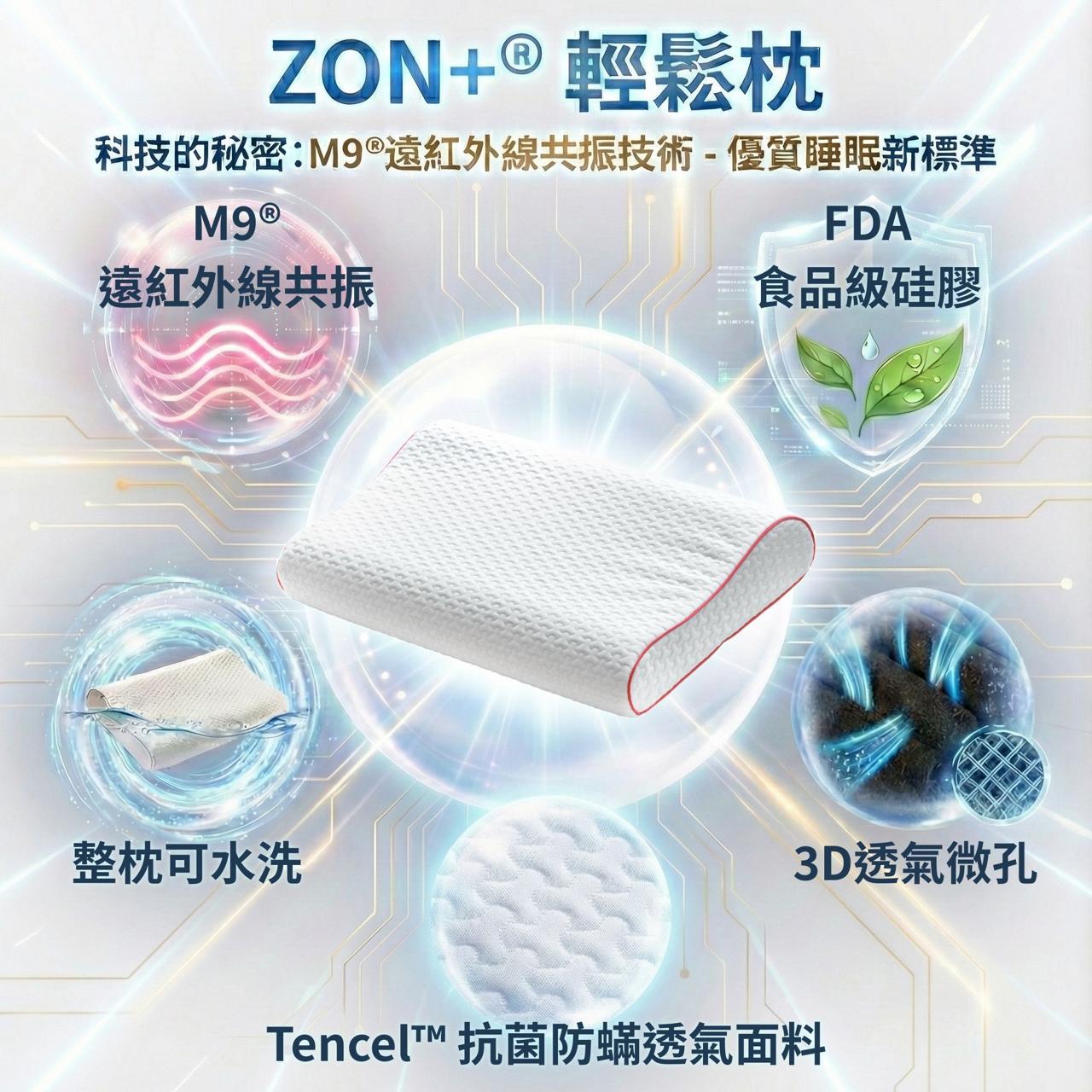 您是否厭倦了輾轉反側的夜晚與睡醒後的肩頸僵硬?ZON+® 輕鬆枕融合尖端科技與頂級用料,為您帶來前所未有的深層放鬆與舒適睡眠。我們獨家的 M9® 遠紅外線共振技術,結合 FDA 食品級矽膠的安心支撐,不僅讓您輕鬆入睡,更能在一夜之間修復疲勞,迎接神清氣爽的早晨。